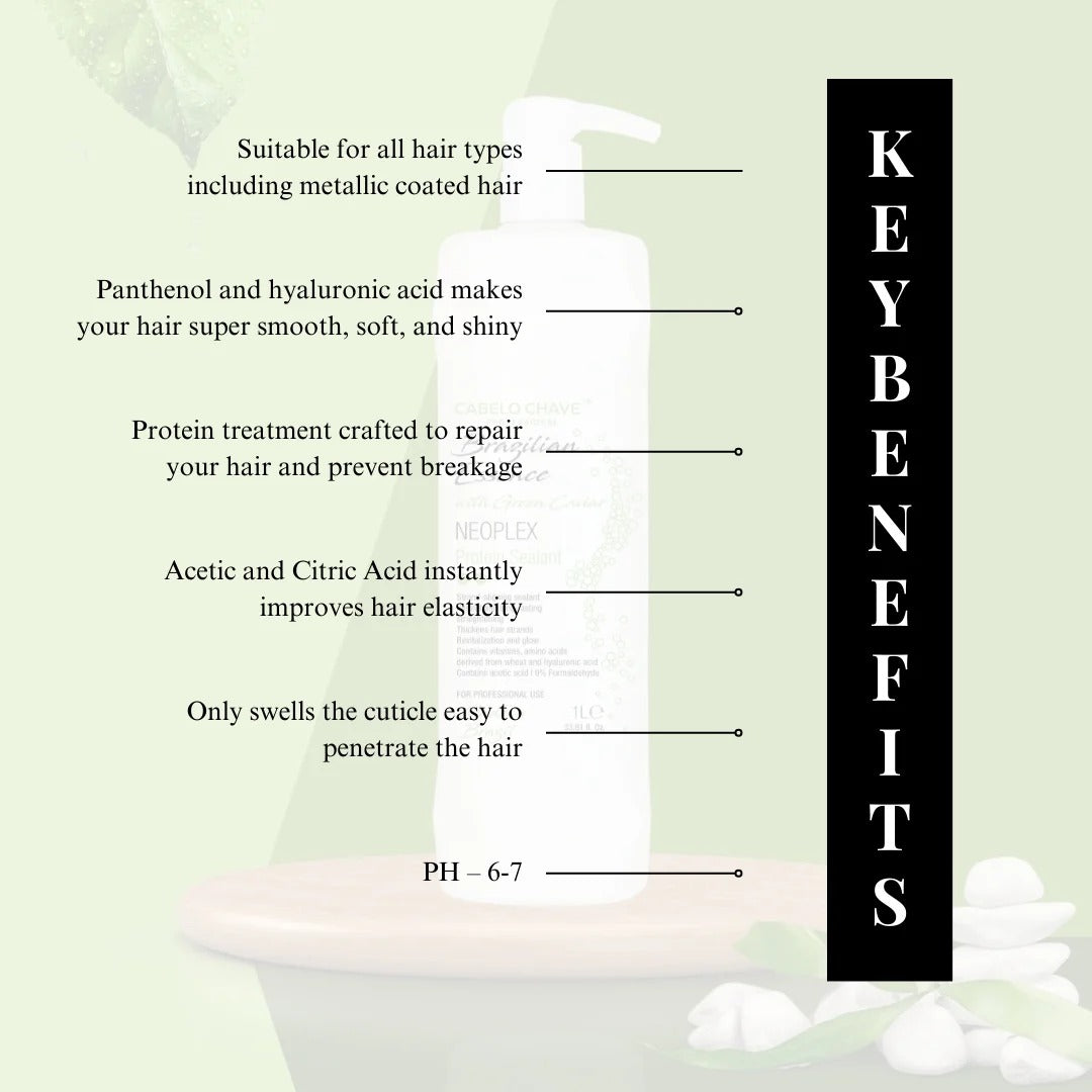 It creates a protective barrier around the hair shaft, maintaining the natural structure and elasticity of hair. Enriched with amino acids and nourishing proteins, Neoplex Pre-Shampoo ensures your hair remains soft, smooth, and resilient even after intensive salon services.